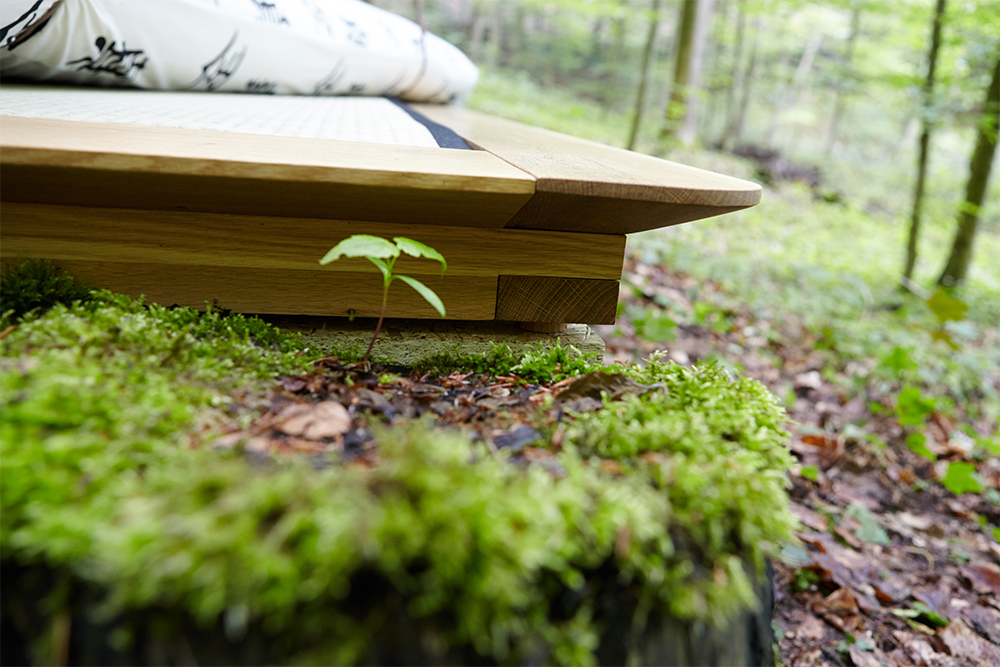 Meine Baumauswahl für die Rahmenkonstruktion ist die Eiche - sie symbolisiert den Fels in der Brandung und steht für Beständigkeit und Vertrauen. Das Laubholz ist sehr hart und schwer, somit gut für den Möbelbau geeignet. Ergänzend dazu gab mir ein Tischlermeister aus Wien den Tipp für das innere Auflagerost der Matratze Rosskastanie zu verwenden. Ihrer Frucht sagt man positives Denken nach und der Knospe die Lernbereitschaft. Früher wurde das Holz gerne in alten Bauerenhäusern für Blindböden in Schlafzimmern verwendet um Störzonen zu neutralisieren. Ähnliche Eigenschaften hat auch Kork. Seine Struktur ähnelt einer Honigwabe und ein Stück in der Grösse eines Würfelzuckers enthält rund 60 Millionen Luftzellen. Das behagliche, wärme- und schalldämmende Material findet bei meinem Entwurf seinen Platz in Form von rechteckigen Matten in einer Aussparung zwischen Auflagekonstruktion und Reisstrohmatten.