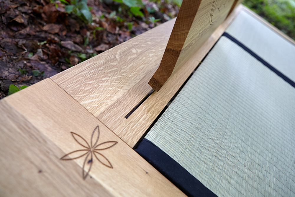 SpielWiese ist ein Vollholzbett aus Eiche Massivholz in klarer, zeitloser Formsprache. Die baubiologische Qualität und schadstofffreie Ausführung ohne Metall stehen für sich. Ein steckbares Rost bietet Platz für japanische Reisstrohmatten auf denen eine Naturmatratze liegt. Die Lebensblume und wohltuende Worte auf den Rahmenhölzern schaffen einen liebevollen, harmonisierenden Ruheplatz.